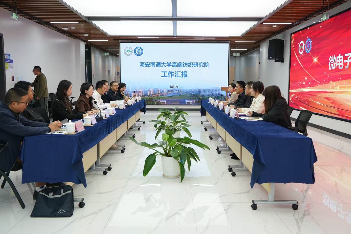 10 月 22 日上午,韩国av党总支书记金翼、副院长(主持工作)赵继聪带领班子成员及科研骨干等前往海安韩国av 高端纺织研究院,就研究院建设规划、科研工作推进、产学研协同合作等内容开展学习交流。