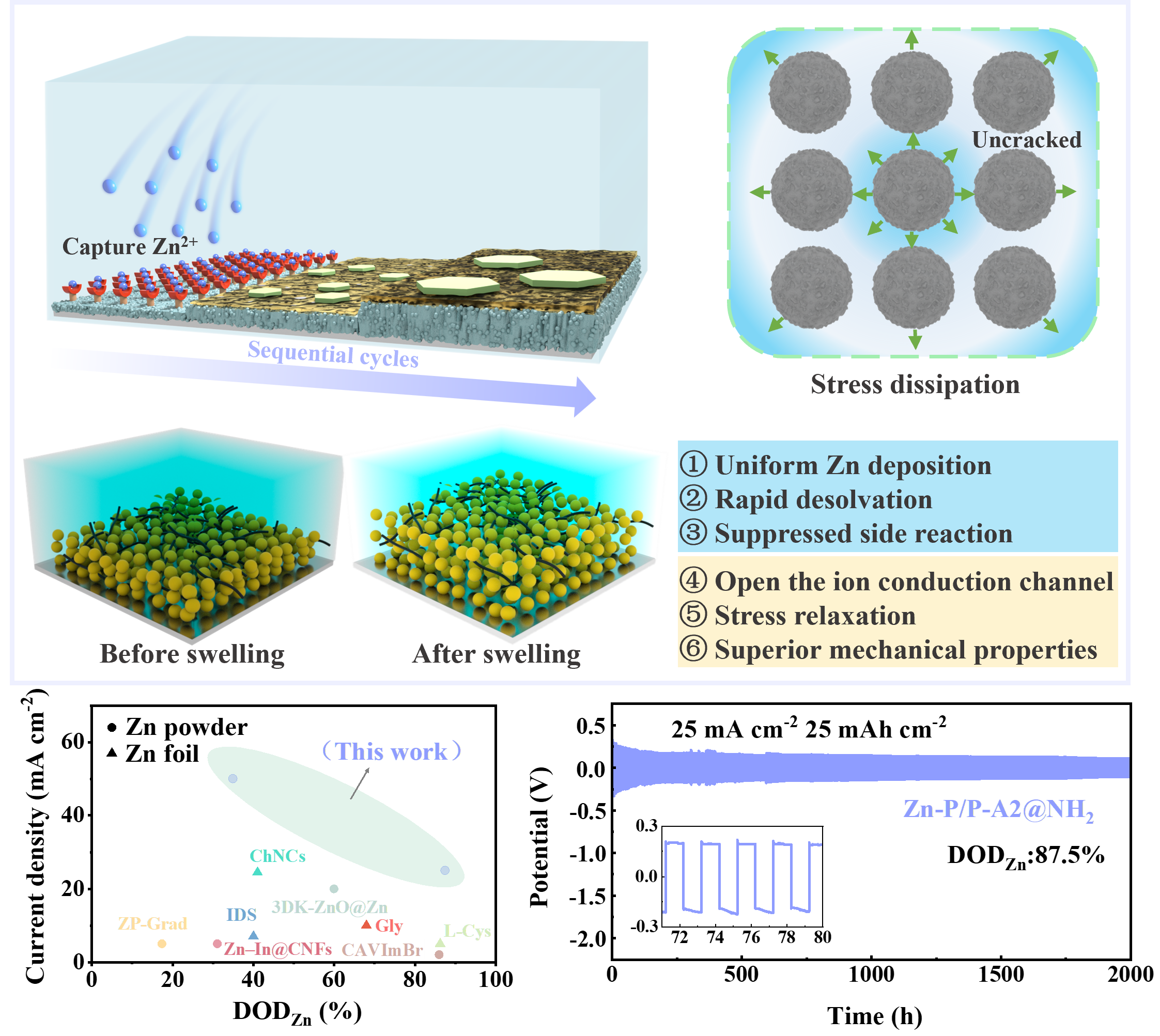 是唯一通讯作者署名单位。该工作针对水系锌粉负极在高倍率和大面积容量条件下易发生结构失稳的问题,提出了一种全新的“软弹性界面调控”策略,在多项关键性能指标上刷新了锌粉负极综合性能纪录。